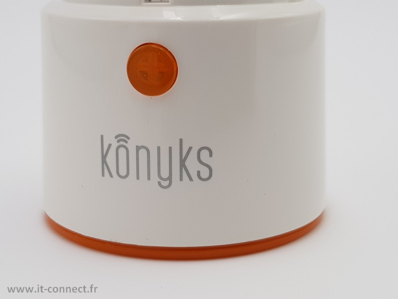 Le fait qu'elle soit compacte rend la prise plus jolie, entièrement blanche, elle a tout de même un bouton de couleur orange et un anneau orange sur l'extrémité. Une couleur orange qui est reprise sur l'intérieur de la prise. Sur le dessus, la mention Konyks est inscrite en gris argenté.