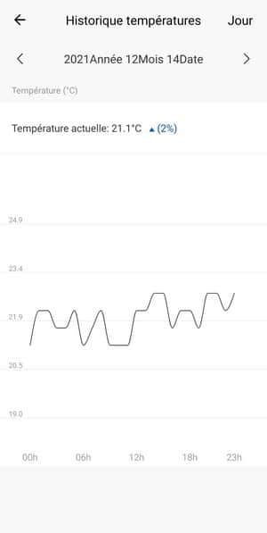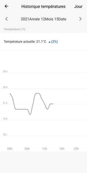 En bas de la fenêtre de l'application, on a un aperçu de l'historique des températures. En appuyant sur le bouton "Historique", on peut consulter l'historique de la température ou du taux d'humidité. Le graphique permet d'afficher l'historique du jour, de la semaine, du mois ou de l'année. Par contre, l'affichage de la date en haut de l'application est un peu étonnant, mais cela devrait être corrigé par une mise à jour.
