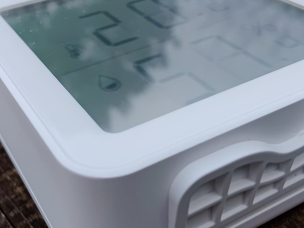 D'un point de vue esthétique, je dirais que le Termo est passe-partout : il a un design moderne et il est blanc, donc en général ça passe bien. L'écran est grand donc on peut lire facilement les informations : la température en haut et le taux d'humidité en dessous. En complément, le niveau d'autonomie de la batterie est affiché, ainsi que l'état du Wi-Fi une fois qu'il est connecté à votre réseau sans-fil.