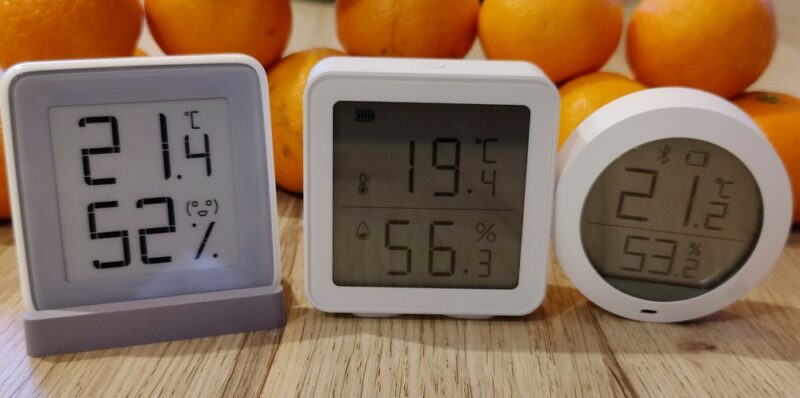 Comme à la maison j'ai également des capteurs de température de chez Xiaomi, j'en ai profité pour réaliser une petite photo des différents modèles. Sur la photo ci-dessous, le modèle Konyks Termo est au centre.