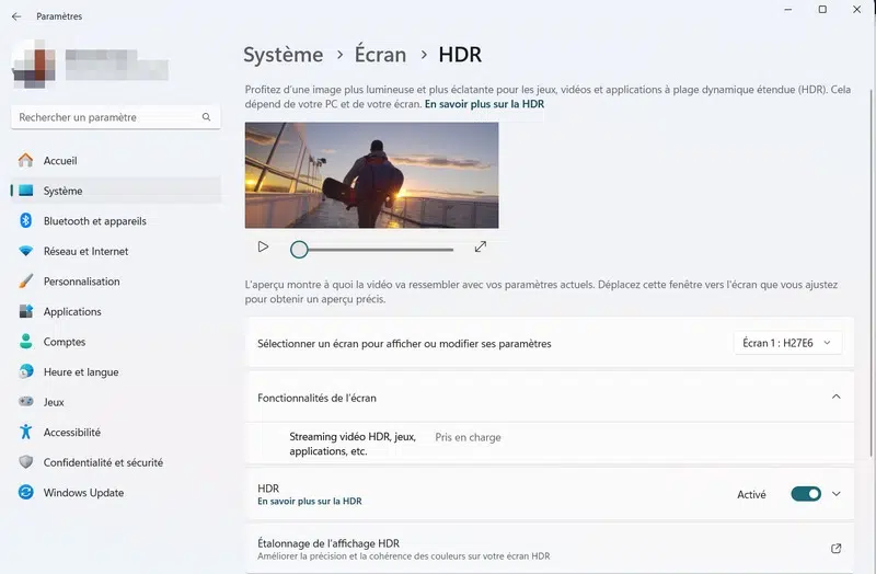 La résolution maximale est le 2K, soit une résolution de 2560 x 1440 px sur cet écran au format 16:9. L'écran est compatible HDR, ce qui n'échappe pas au système Windows 11. En effet, les options "HDR" sont disponibles dans les paramètres de Windows 11.