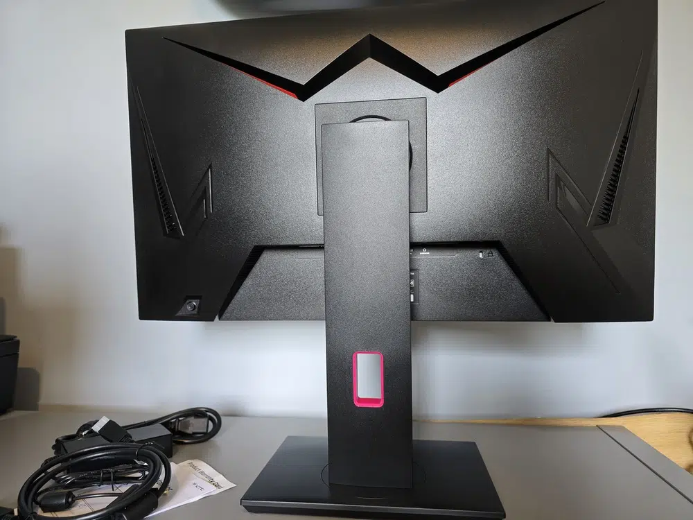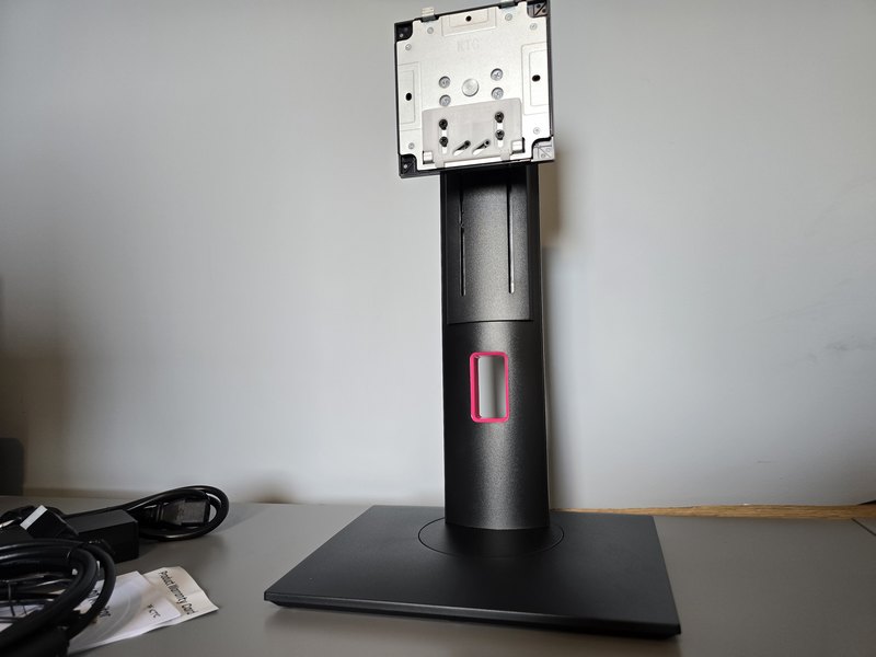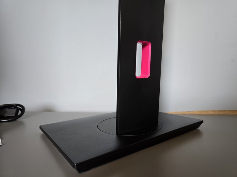 La base du pied est très simple puisqu'elle est entièrement noire et rectangulaire. Ce n'est pas le pied le plus élégant de la marque. Le montage s'effectue en quelques secondes, sans outil. Sur le montant du pied, vous remarquerez une touche rose plutôt flashy au niveau du trou conçu pour le passage des câbles. C'est le seul élément coloré présent sur le pied de cet écran : certains gamers diront surement qu'il manque de style.