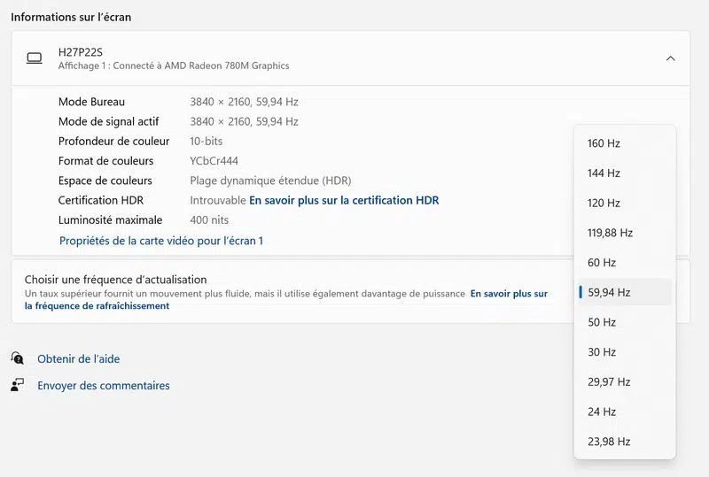 La configuration de l'écran à partir des paramètres de Windows 11 montre que nous pouvons modifier le taux de rafraîchissement à souhait. L'occasion de voir qu'il est possible d'être en 160 Hz ou 144 Hz.
