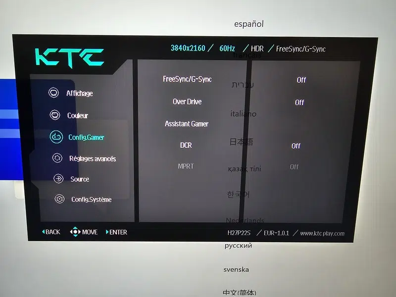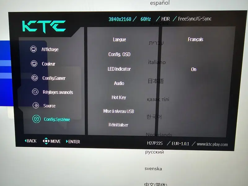 Le bouton présent à l'arrière de l'écran, et qui nécessite un temps d'adaptation afin d'être maitrisé, permet de changer de source et de régler l'écran. Grâce à tous les paramètres accessibles via le menu de l'écran, vous pouvez ajuster l'image selon vos préférences (luminosité, contraste, couleurs, netteté, équilibrage des noirs, etc.). De plus, vous pouvez activer ou désactiver certaines fonctionnalités telles que FreeSync et la fonction de protection pour la lumière bleue. Le menu est disponible en plusieurs langues, dont le français.