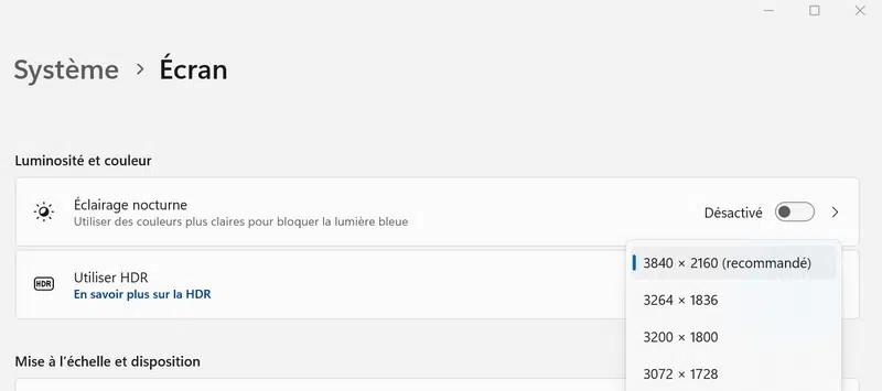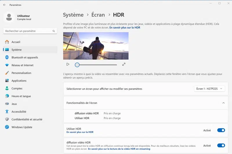 L'écran est compatible HDR, ce qui n'échappe pas au système Windows 11. En effet, les options "HDR" sont disponibles dans les paramètres de Windows 11. Vous pouvez utiliser le mode automatique qui permet d'upgrader certains jeux.
