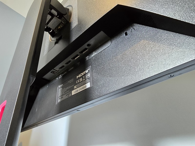 Les connectiques sont situées à l'arrière de l'écran et elles sont centrées. Nous retrouvons bien les 2 ports HDMI 2.1 et les 2 ports DisplayPort 1.4 promis par la fiche technique du constructeur, sans oublier la prise jack pour connecter un casque ou des enceintes. Cet écran peut accueillir un PC, une PS5, une Nintendo Switch ou une Xbox, selon vos besoins.