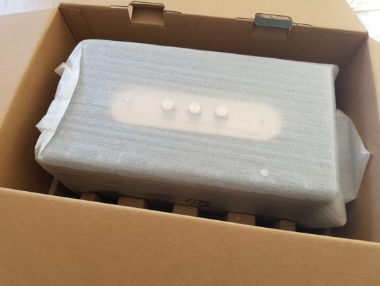 Une fois déballée et ce beau bébé de 4.65 kg posé sur le plan de travail de la cuisine, on se retrouve face à un produit très élégant. La taille et le poids de l'enceinte nous rappellent rapidement qu'il ne s'agit pas d'un produit nomade. Pour ma part, je vous présente la version noire, mais il existe également une version blanche et une troisième marron.