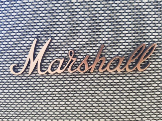 Il y a une belle harmonie au niveau des couleurs, puisque cette plaque Marshall d'aspect doré nous rappelle les couleurs du panneau de contrôle sur le dessus et la plaque dans le bas de l'enceinte, avec un effet brossé. L'enceinte repose sur quatre pieds antidérapants lorsqu'elle est posée.