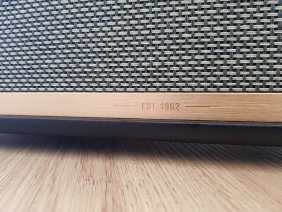 Cette enceinte, comme les autres de la gamme, a un look vintage qui a des airs d'amplis de guitare Marshall. Le cadre est recouvert en simili cuir, d'ailleurs le boîtier de l'enceinte est en bois. La grille sur la façade avant est en plastique bicolore et tressé. Au centre, nous retrouvons l'insigne Marshall qui apporte une touche d'élégance à l'enceinte.