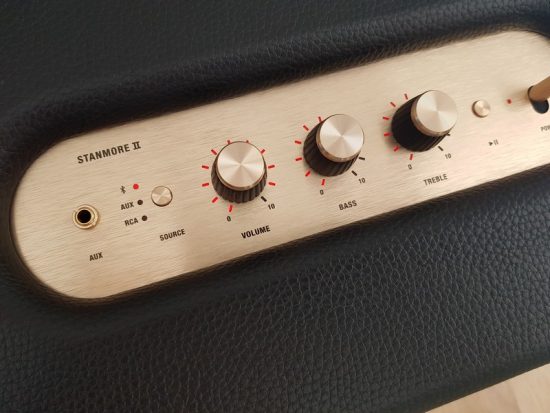 Sur le dessus, nous retrouvons un panneau de contrôle très élégant et totalement dans l'esprit Marshall. La finition est très belle... La prise jack se trouve sur le dessus, contrairement à la prise RCA qui est à l'arrière. D'ailleurs, cette prise RCA offre la possibilité de connecter une platine vinyle directement sur la Stanmore II.