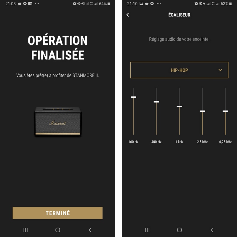 Concernant la qualité audio, c'est vraiment très satisfaisant. Il y a des basses très profondes, et le tout est bien équilibré. En plus, l'application Marshall propose un égaliseur avec des styles musicaux prédéfinis mais il est aussi personnalisable à souhait. En complément, n'oublions pas les boutons positionnés sur le dessus de l'enceinte pour un contrôle direct des basses et des aigus. Tout y est pour séduire les amateurs de musique !