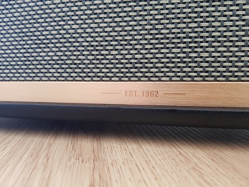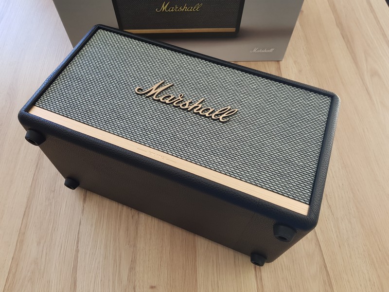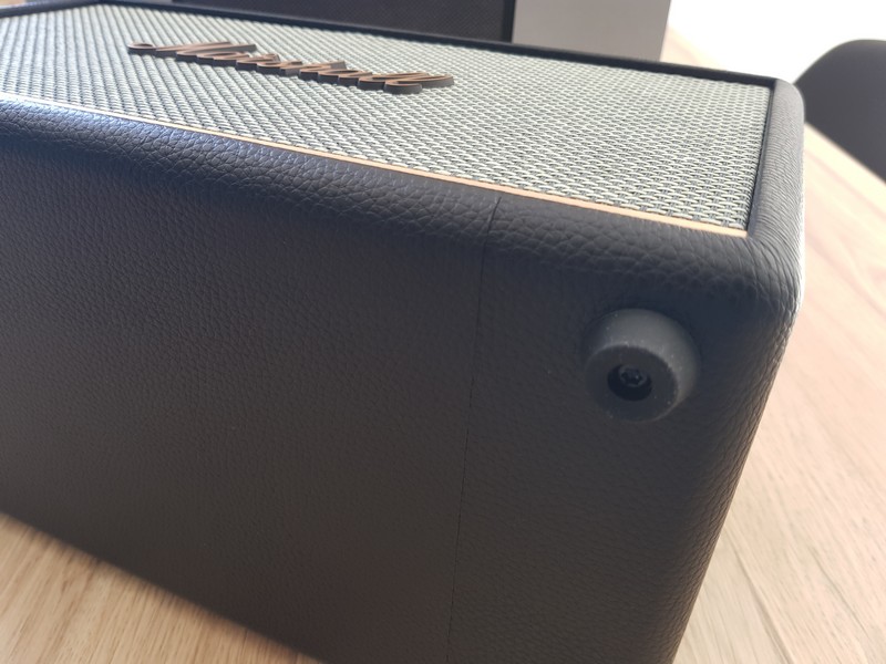 Il y a une belle harmonie au niveau des couleurs, puisque cette plaque Marshall d'aspect doré nous rappelle les couleurs du panneau de contrôle sur le dessus et la plaque dans le bas de l'enceinte, avec un effet brossé. L'enceinte repose sur quatre pieds antidérapants lorsqu'elle est posée.