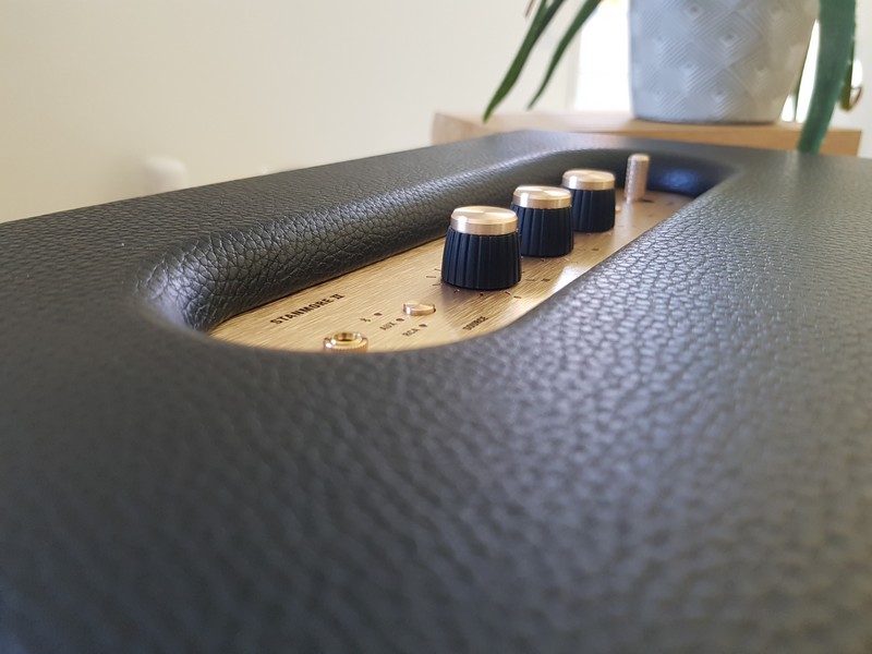 Sur le dessus, nous retrouvons un panneau de contrôle très élégant et totalement dans l'esprit Marshall. La finition est très belle... La prise jack se trouve sur le dessus, contrairement à la prise RCA qui est à l'arrière. D'ailleurs, cette prise RCA offre la possibilité de connecter une platine vinyle directement sur la Stanmore II.