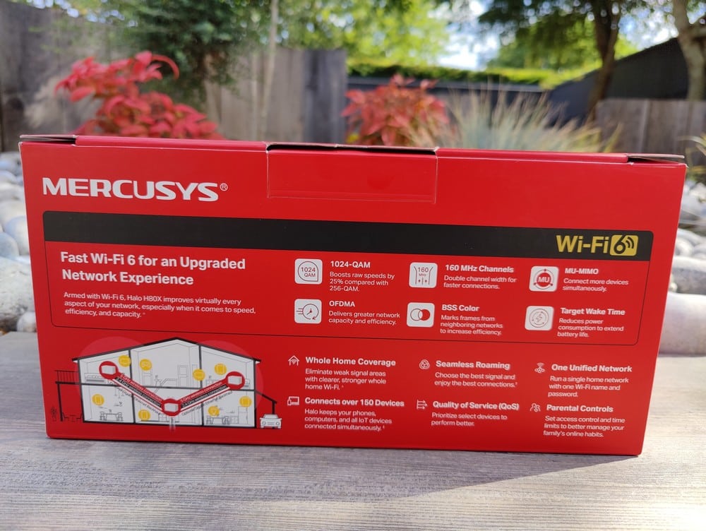 La jolie boîte Mercusys donne de nombreuses informations sur le kit en lui-même, notamment des détails techniques qui permettent de mettre en avant les avantages du Wi-Fi 6 : la fonction BSS Color pour lutter contre les interférences, l'OFDMA pour rendre le réseau plus efficace et permettre la prise en charge d'un plus grand nombre d'utilisateurs, ou encore le MU-MIMO qui signifie que le routeur peut communiquer avec plusieurs périphériques en même temps, y compris lorsque les flux sont gourmands. Dommage que ce soit écrit en anglais.