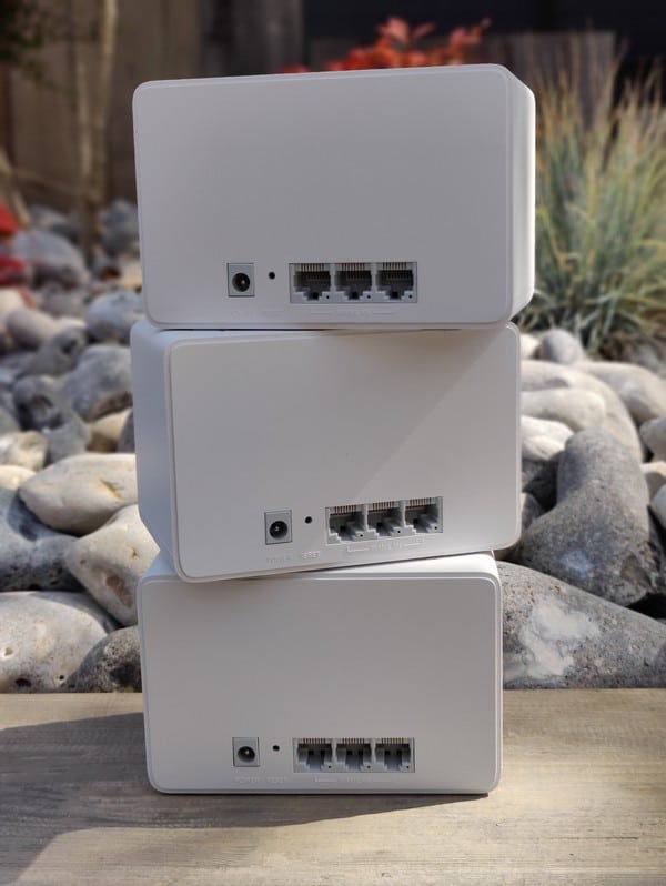 Les trois boîtiers Halo inclus dans ce kit sont identiques, aussi bien en termes de performances que de connectiques. D'ailleurs, on constate que chaque boîtier est doté de 3 ports Ethernet RJ45 en 1 Gbit/s, en complément d'un bouton Reset et du port pour l'alimentation. Le fait que chaque boîtier dispose de trois ports RJ45 est un avantage. Par contre, il est à noter qu'il n'y a pas de port USB, ce qui ne permettra pas de partager facilement un appareil USB sur le réseau.