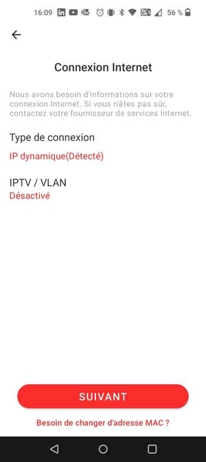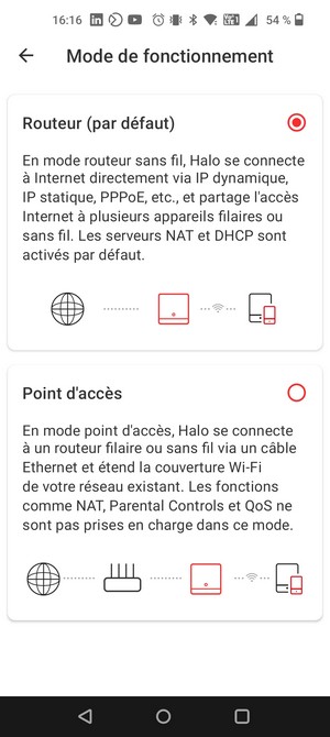 C'est ici que commence l'installation : l'application vous guide étape par étape, en français. Avec le mode d'installation par défaut, la borne WiFi Mercusys est positionnée en tant que routeur, c'est-à-dire à la place de votre Box. Toutefois, ça peut être contraignant si votre opérateur ne vous laisse pas mettre un autre routeur à la place de sa Box sans devoir apporter une configuration spécifique (authentification, par exemple). Pour information, vous pouvez aussi conserver votre Box et passer en mode point d'accès par la suite, comme ça la Box reste en place et la solution Mercusys gère le réseau WiFi (qu'il faudra désactiver sur la Box).