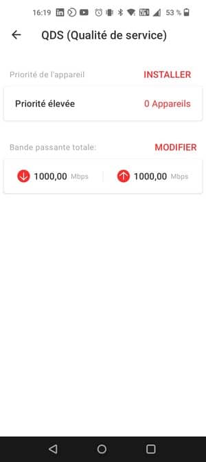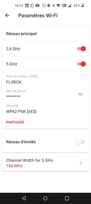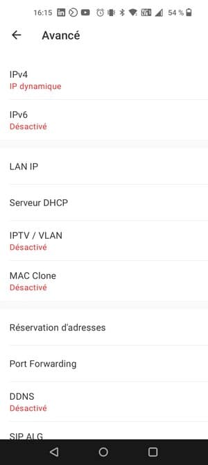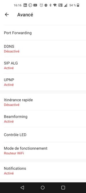 Le réseau Wi-Fi est entièrement personnalisable depuis l'application mobile, que ce soit pour changer le nom du réseau, configurer une clé de sécurité différente, ou encore gérer le réseau pour les invités. Si le boîtier est utilisé comme routeur, vous avez aussi la possibilité de configurer le serveur DHCP, les règles de redirection de ports, le NAT, les DDNS ou encore de gérer les VLANs. Pour la partie Internet, et répondre aux exigences de certains FAI, l'interface WAN peut utiliser un VLAN Internet spécifique, et même utiliser une adresse MAC définie manuellement (qui peut être celle de votre Box).