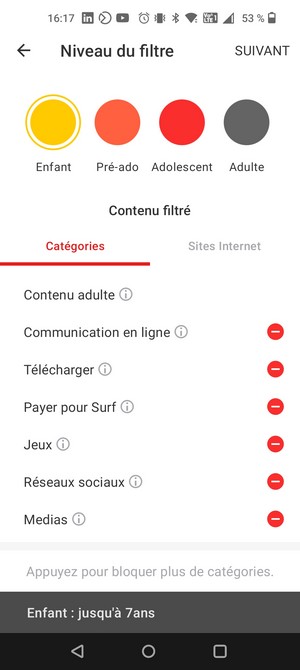 Mercusys a intégré une fonctionnalité qui s'adresse directement aux parents : le contrôle parental. Ainsi, il est possible de filtrer la navigation sur Internet en bloquant certaines catégories de sites. Vous pouvez aussi gérer le temps de connexion pour chaque appareil, car chaque profil créé peut s'appliquer sur un ou plusieurs périphériques connectés à votre réseau. L'application permet de créer plusieurs profils, avec chacun ses propres règles.