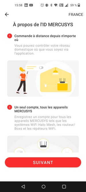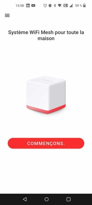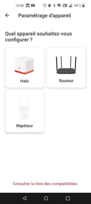 Vous allez me dire "qu'est-ce que j'en fais du boîtier ?", et bien c'est l'application Mercusys qui va répondre à cette question puisqu'elle est là pour nous guider tout au long du processus de mise en route. Elle est disponible sur Android et iOS et implique la création d'un compte pour être utilisée avec ce kit WiFi Mesh. Suite à la création du compte, il faut démarrer l'assistant et choisir le type d'appareils "Halo".