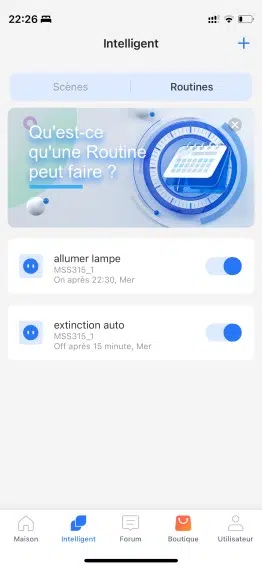 Les routines permettent de gérer les appareils ou une scène à des heures précises ou suivant un délai (Par exemple : éteindre un appareil après 15 min d’activité).