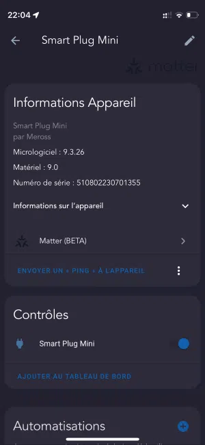 L’appareil est intégré et vous le retrouvez dans l’intégration Matter (BETA). Les automatisations et autres fonctionnalités sont possibles avec la prise. Malheureusement, la partie consommation d’énergie n’est pas disponible non plus avec HA.