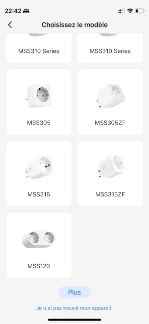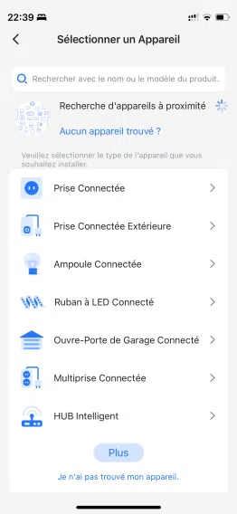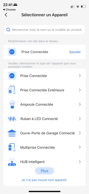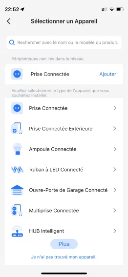 L’intégration se fait comme n’importe quel autre périphérique, une fois que la prise est en mode appairage, celle-ci est automatiquement détectée. Ensuite, l’application vous propose de l’intégrer ou comme pour l’application MEROSS, aller dans le menu d’ajout de matériel et sélectionner la catégorie de prise compatible.