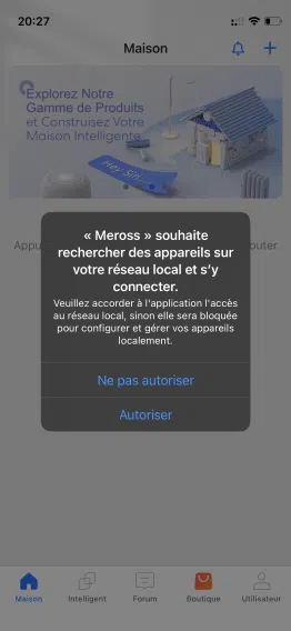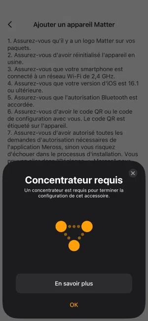 Les tests ont été effectués sur deux smartphones Apple et Android, pour les deux le résultat est le même. L’application Meross recherche par défaut un contrôleur Matter intégré dans l’application native des objets connectés de l’OS du périphérique. Vous avez donc le message d’erreur indiquant qu’il n’y a pas de contrôleur Matter (ceci n’est valable que pour les personnes qui n’ont pas de contrôleur dans Home d’Apple ou de Google).