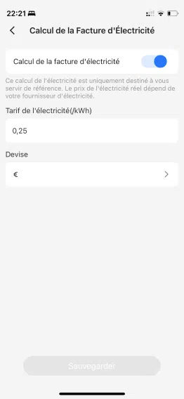 En plus des graphiques, vous pouvez calculer le montant de la consommation (pour cela, il faut renseigner le tarif du kWh dans les réglages du périphérique). D’autres options sont disponibles comme l’export des données énergétiques par e-mail, un mode de surveillance d’énergie (Consommation ou production).