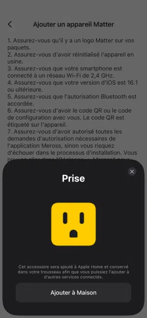 Dès que la prise est intégrée à votre contrôleur Matter (pour mon cas HomeAssistant), retournez dans l’application Meross. Cliquer sur l’ajout d’un appareil, l’application effectue une recherche comme pour un nouvel appairage et affiche la prise trouvée (attention, il faut être sur le même réseau).