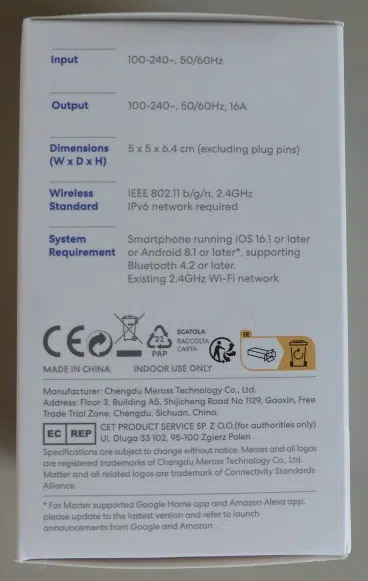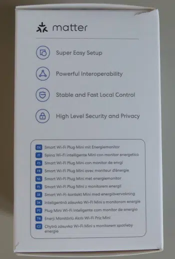Nous retrouvons sur la face principale le nom et la référence du produit, une photo de celui-ci, mais surtout l’indication que ce produit est compatible Matter. Sur les autres faces, nous retrouvons les caractéristiques (face droite), la garantie et les moyens de contact de la marque (face arrière), une description (face gauche) et le logo de la marque (dessus).