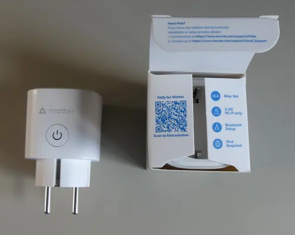 Comme beaucoup de modèle de prise, celle-ci est blanche. Sur une des faces, vous retrouvez les caractéristiques (Marque, Modèle, tension d’entrée et intensité de sortie), sur une seconde le bouton de commande manuelle et le rappel que la prise est au standard Matter et sur une 3ème face, le QR Code servant à l’intégration dans votre système.