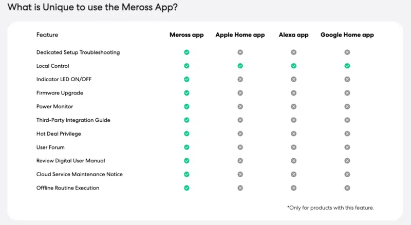 Les produits proposés sont compatibles avec/sans hub fourni par le constructeur, principalement en Wifi et sont intégrables à des systèmes existants (Google Home, Apple Home Kit, Alexa, SmartThings de Samsung, etc…). Afin de bénéficier de tous les services MEROSS, il est préférable d’utiliser leur application et leur Hub comme leurs concurrents.