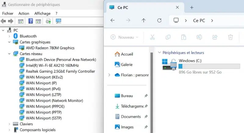 Un tour dans le gestionnaire de périphériques permet d'en savoir plus sur le modèle des cartes réseau. Nous pouvons aussi constater que la capacité utile du disque SSD NVMe de 1 To est de 952 Go. Par défaut, le disque du système est chiffré par BitLocker comme le montre l'image ci-dessous.