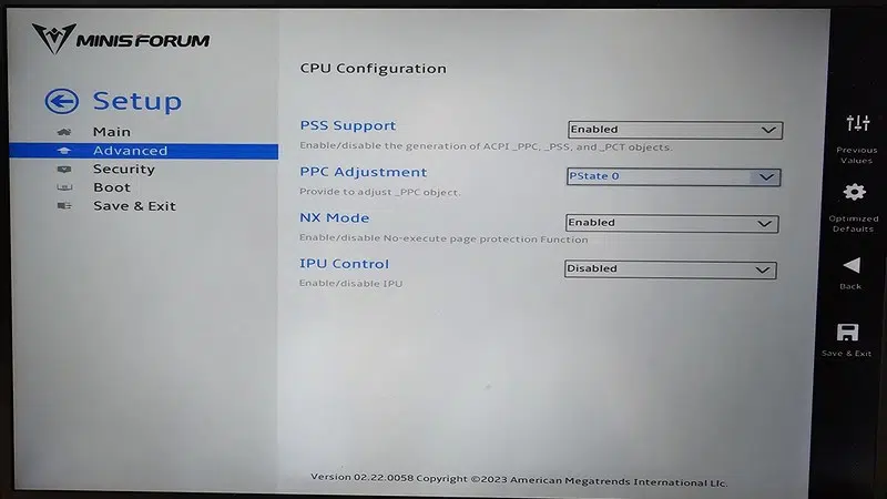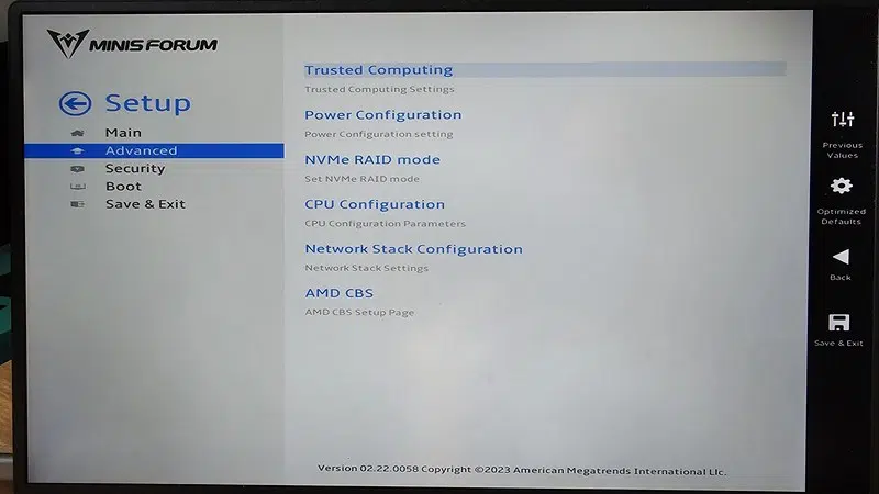 Enfin un BIOS UEFI moderne sur un mini PC ! L'interface austère de certains BIOS est remplacée par une interface graphique au sien de laquelle nous pouvons naviguer avec la souris. Au-delà de l'expérience agréable, nous avons accès à de nombreuses options de configuration. C'est appréciable. Ceci est l'occasion d'évoquer la fonction "NVMe RAID mode" utile si vous installez deux SSD NVMe dans le boitier, car vous pouvez les monter en RAID 0 ou RAID 1 ! Une fonction très intéressante notamment si l'on veut protéger ses données contre une panne matérielle (RAID 1).