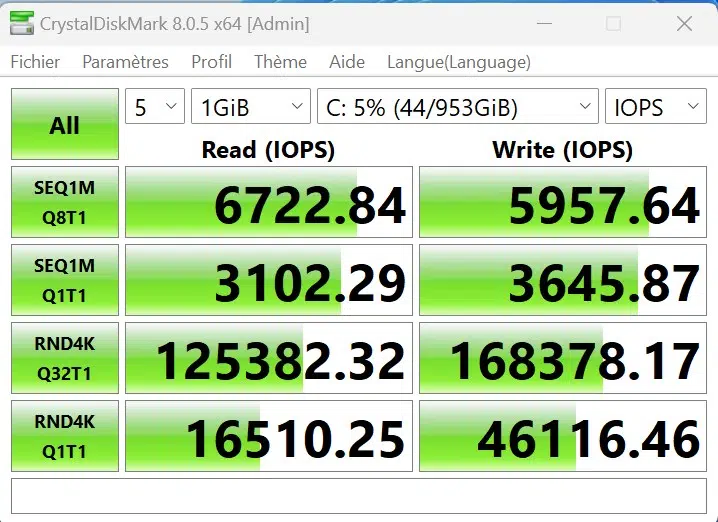 Voici un benchmark du disque effectué avec Crystal Disk Mark :