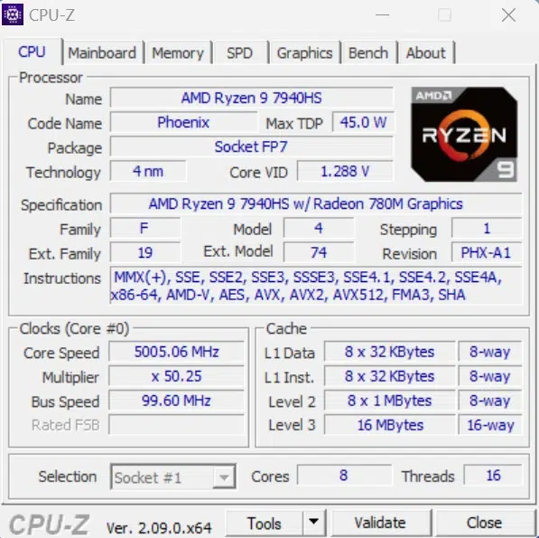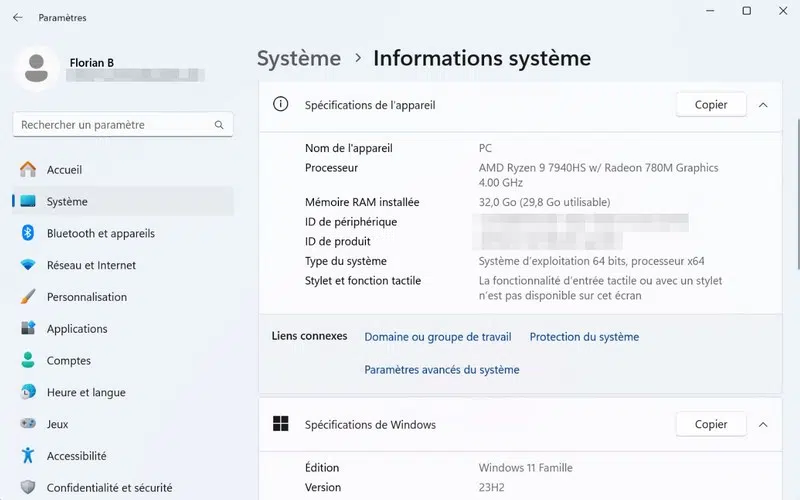 - Processeur : AMD Ryzen 9 7940HS (8 cœurs, 16 threads, 16 Mo de cache, burst jusqu'à 5,20 GHz)