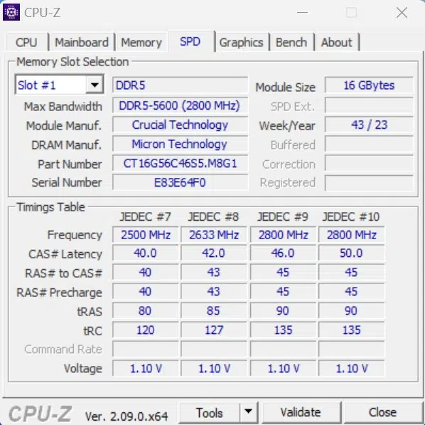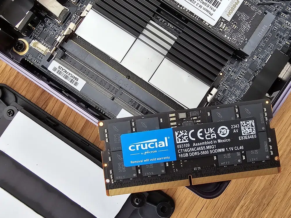 - Deux barrettes de RAM de marque Crucial : 16 Go en DDR5-5600. Soit 32 Go au total.