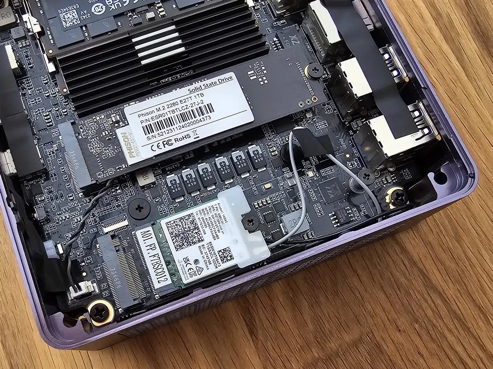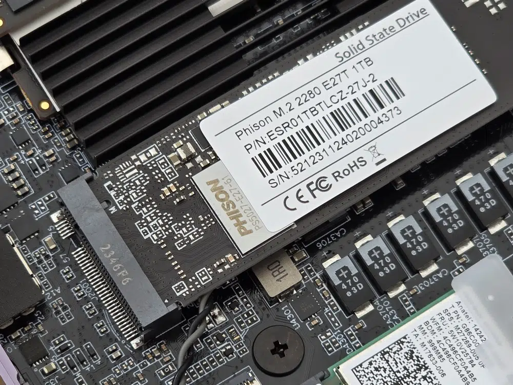 - Un SSD NVMe de marque Phison, avec la référence E27T, d'une capacité de 1 To est présent dans le boitier. Il s'agit d'un SSD au format M.2 2280. Il y a un emplacement libre, à côté, au-dessus de la carte Wi-Fi, pour un second SSD.