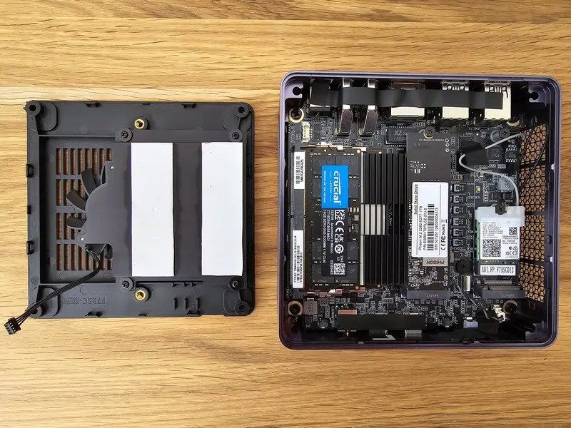L'ouverture du boitier donne l'occasion d'en savoir plus sur les références utilisées pour la RAM et le SSD NVMe. Ce sera aussi l'opportunité de voir si les composants sont facilement remplaçables.