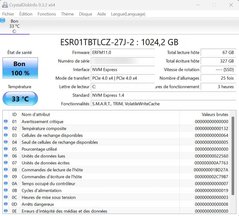 Voici une analyse CrystalDiskInfo du disque SSD NVMe Phison monté en PCIe 4.0 x4.