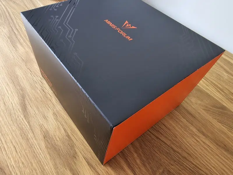 Minisforum nous propose un packaging soigné, avec une jolie boite noire et orange protégée par un blister et qui s'ouvre en deux temps. Elle donne des précisions sur le modèle de mini PC, ainsi que sur la version présente à l'intérieur de la boite. Justement, au sein de la boite, nous découvrons en premier lieu le mini PC. Il est très bien protégé et paisiblement installé dans un bloc de mousse.
