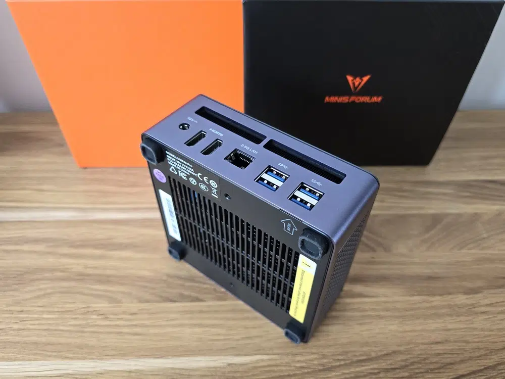 À l'arrière du boitier, il y a le port d'alimentation du boitier, les deux ports HDMI 2.0, le port RJ45 2.5 Gbit/s (compatible 1 Gbit/s) pour le réseau filaire ainsi qu'un ensemble de 4 ports USB 3.2 Gen 2 avec un connecteur Type-A. Au total, le mini PC dispose de 6 ports USB. La connectique est surplombée par le système de refroidissement qui procédera à l'extraction de l'air chaud par l'arrière du boitier.