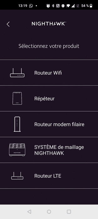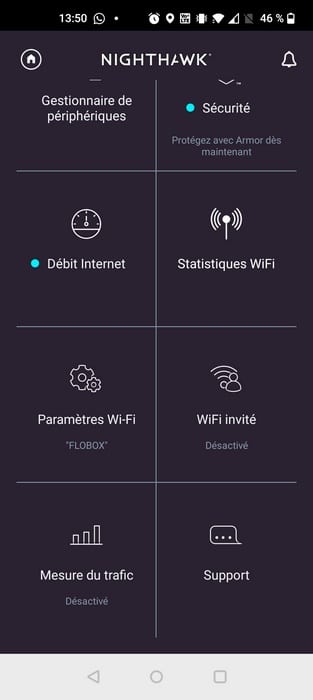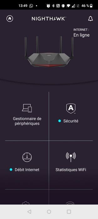 Je souhaitais terminer cette section par l'application mobile NETGEAR Nighthawk. Elle ne sert pas seulement à initialiser le routeur : elle offre une visibilité sur l'état du routeur, depuis son smartphone. En comparaison de l'interface web de DumaOS, c'est beaucoup plus limité et elle ne donne pas accès à toutes les fonctions avancées. Cela reste assez basique bien qu'utile, voici quelques exemples : voir les appareils connectés au réseau, effectuer un test de débit, voir l'état du réseau WiFi.