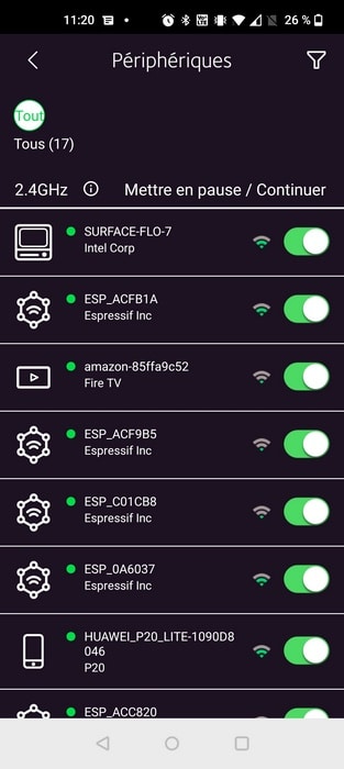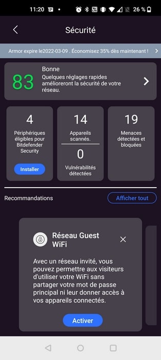 L'application sert à voir l'activité associée à la fonctionnalité "Netgear Armor" qui indique le score de sécurité de votre réseau. Lorsqu'un appareil se connecte au réseau pour la première fois, le routeur va le scanner à la recherche de vulnérabilités et une notification sera envoyée sur votre smartphone. En complément, cette fonctionnalité peut bloquer des domaines malveillants ou associés à du spam. Propulsée par Bitdefender, cette protection est payante (elle est désactivée à la fin de l'essai de 30 jours) : 99,99 dollars par an, soit environ 92 euros. Dommage que ce soit payant, car c'est pertinent comme solution.