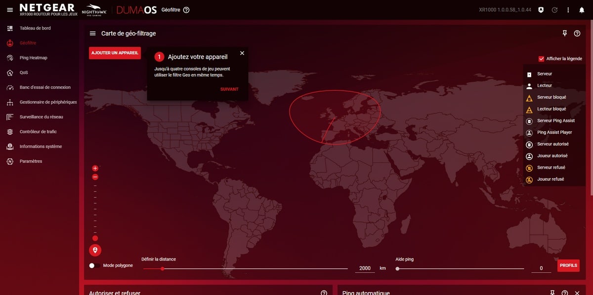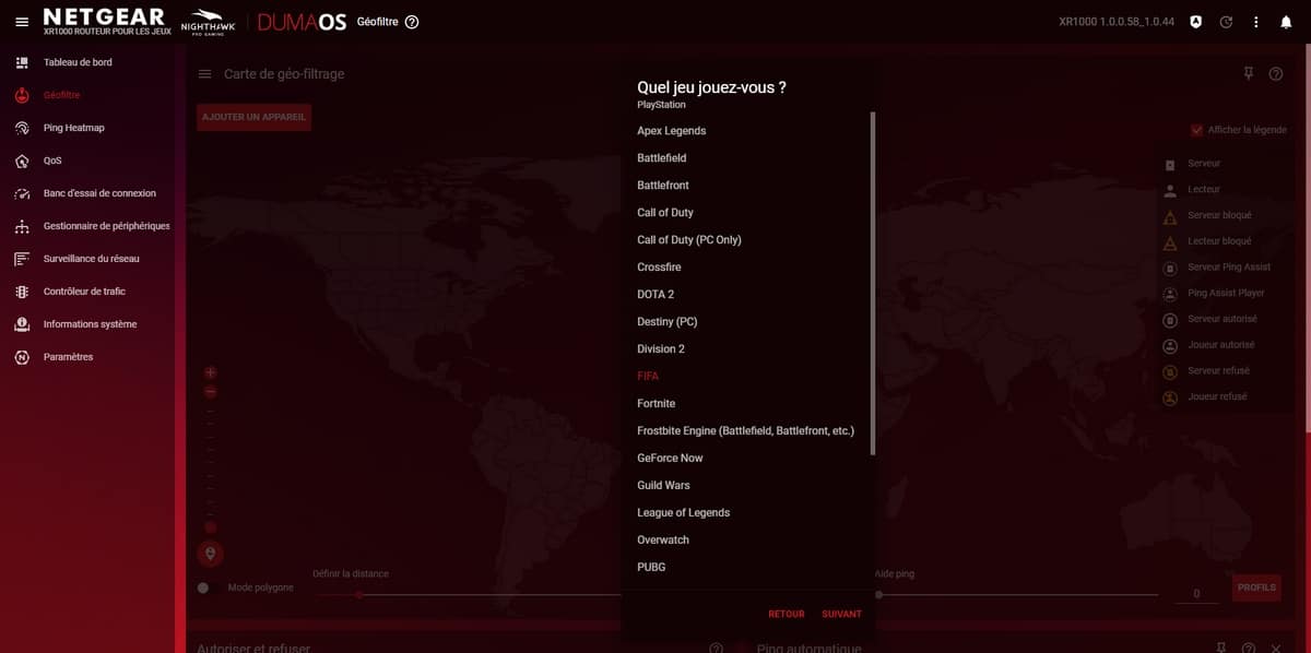 Sur la gauche, on peut accéder aux différentes fonctionnalités. Commençons par la première : Géofiltre. Cette fonctionnalité va permettre d'optimiser vos parties de jeux en ligne en sélectionnant un serveur de jeu présent dans une certaine géographique. En complément, on peut également filtrer par ping : un serveur avec une forte latence, ne sera pas sélectionné. Le routeur peut gérer jusqu'à 4 consoles/machines en même temps, et prend en charge une vingtaine de jeux.