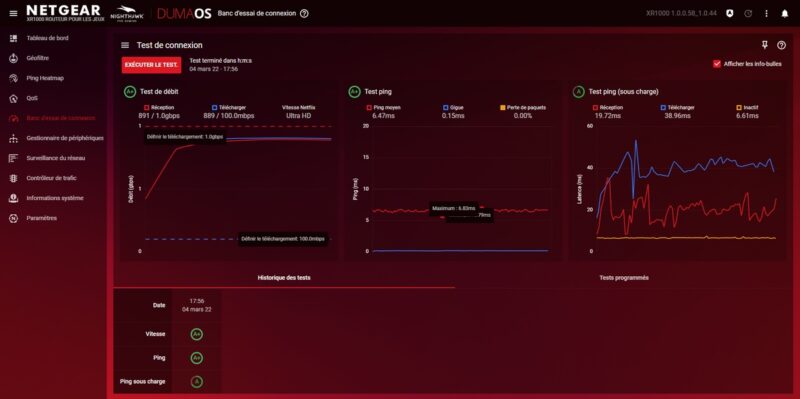 DumaOS intègre un outil nommé "Banc d'essai de connexion" dont l'objectif est d'effectuer un test de débit de votre connexion : débit en réception, débit en émission, ainsi que le ping. Il est même indiqué la qualité à laquelle vous pouvez prétendre sur Netflix, en fonction de votre débit, ici on peut voir "Ultra HD" : vive la fibre ! 😉
