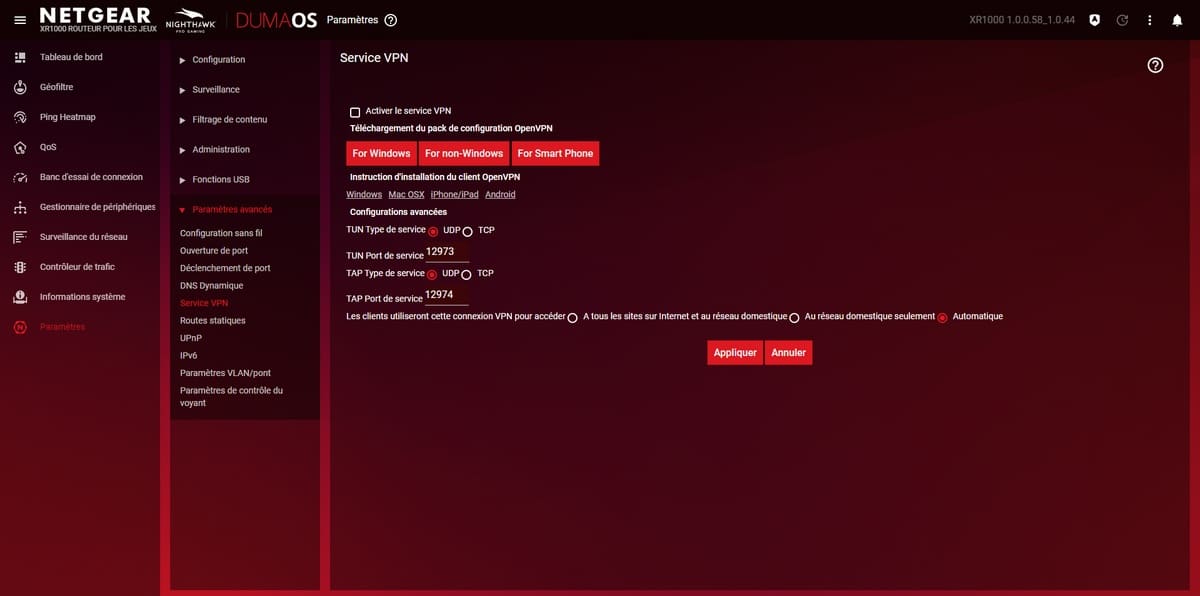 Enfin, la section "Paramètres" va permettre d'accéder à tous les paramètres avancés complémentaires : configuration du réseau WiFi, redirection de ports, activation de l'accès VPN via OpenVPN, création de VLANs, blocage de services, blocage de sites, configuration DNS dynamique, etc. Disons que c'est la partie du système qui fera plaisir aux utilisateurs avertis. 😉