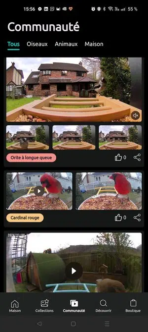 - La section "Communauté" vous permet de découvrir d'autres espèces d'oiseaux grâce aux captures partagées par les membres de la communauté Birdfy