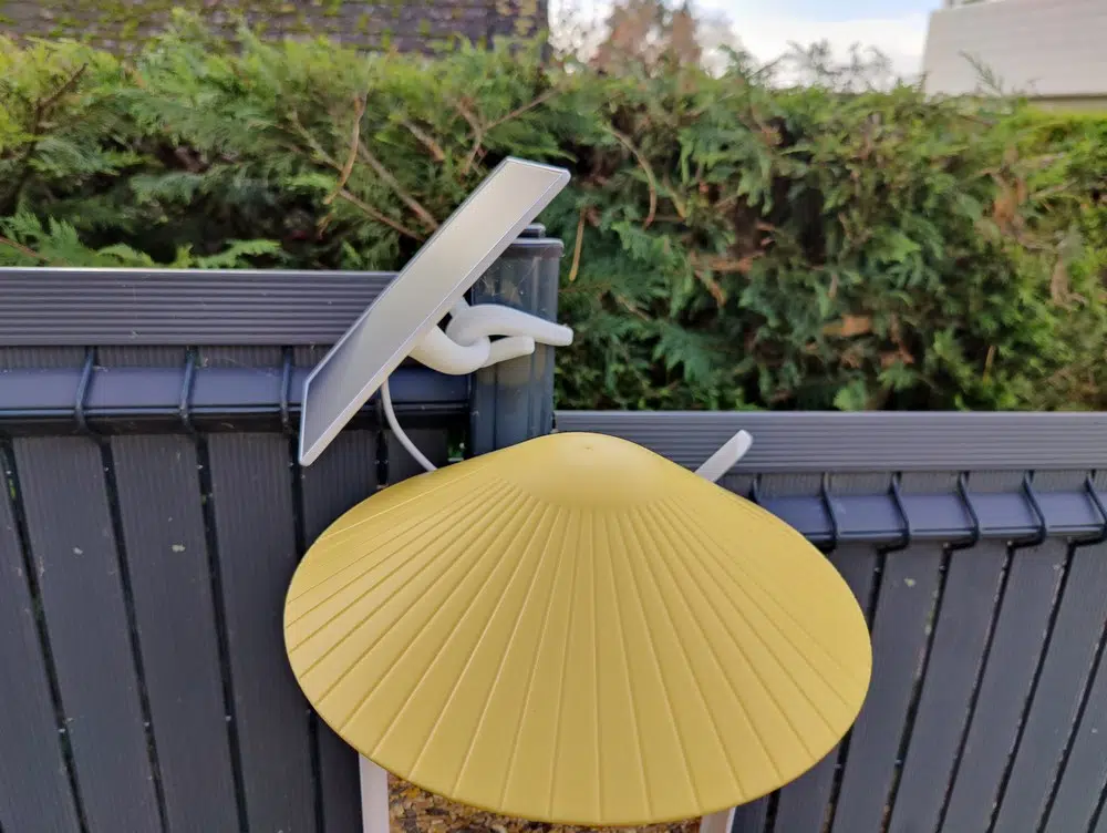Le panneau solaire a été fixé sur la partie supérieure du poteau de clôture, avec une orientation plein sud. Le panneau solaire est relié à la caméra grâce au câble USB fournit par Netvue. La caméra est constamment à 100% de batterie grâce à l'énergie fournie par le panneau solaire. C'est un très bon point. Une fois que l'installation est effectuée, nous n'avons pas à revenir dessus, si ce n'est qu'il faudra alimenter la réserve de grains.