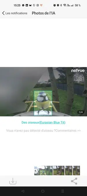 Par ailleurs, si vous souhaitez bénéficier d'une reconnaissance complète permettant de différencier les humains, les animaux, les animaux domestiques, ou encore les véhicules et les colis, vous devez prendre un abonnement "Netvue Protect". Pour une seule caméra, le plan de base est proposé à 3.99$ par mois. Puisqu'il s'agit d'une caméra Birdfy, nous pouvons profiter de l'IA de façon gratuite uniquement pour la reconnaissance des oiseaux. Pour le reste, la caméra va détecter les mouvements, mais sans faire de distinction. C'est dommage, car le système de détection est réellement efficace.